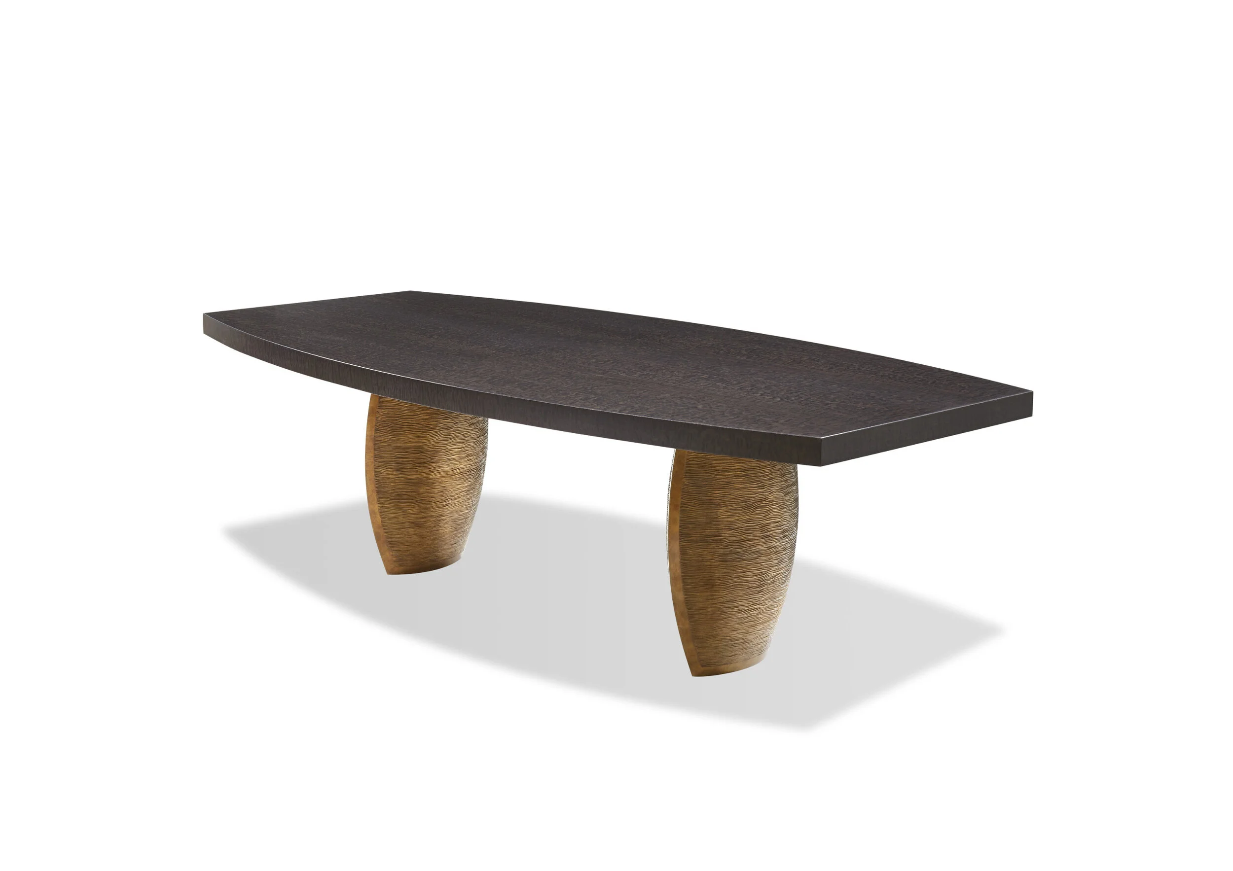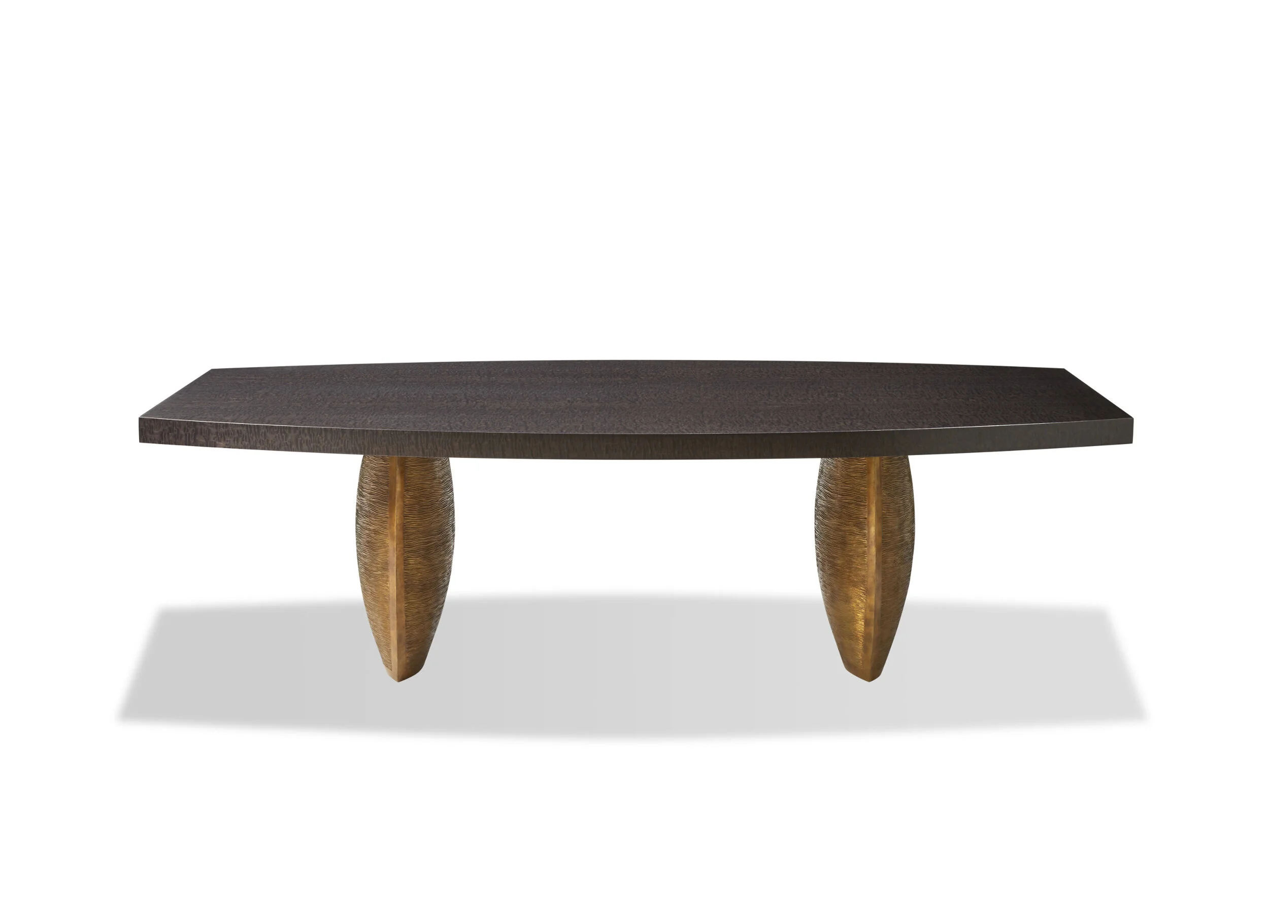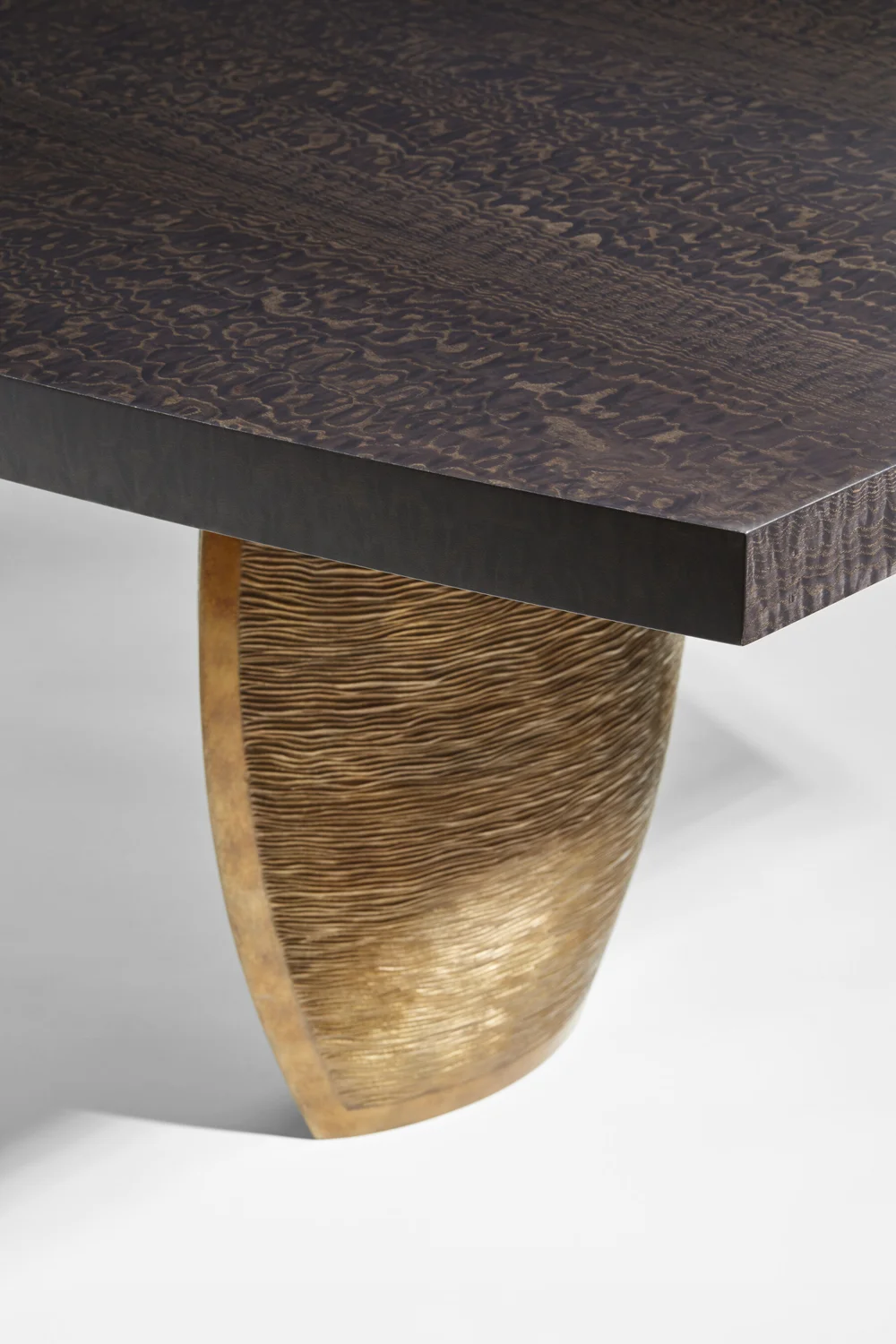 The Anaita Dining Table by Philippe Hurel is a striking composition of rare materials and sculptural presence. Its expansive top is exquisitely veneered in exotic Tamo Kuri wood, celebrated for its distinctive figuring and luminous movement, creating a surface of remarkable depth and character.