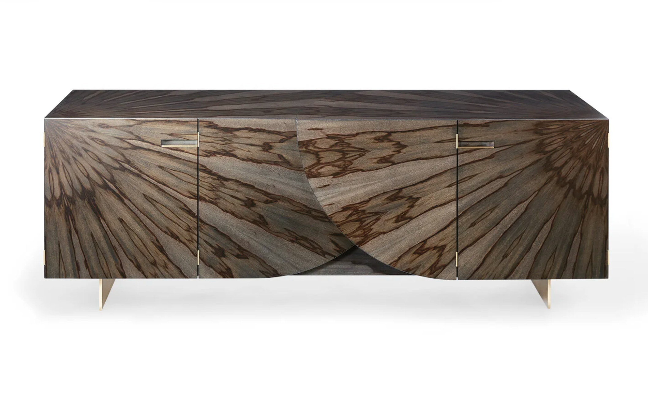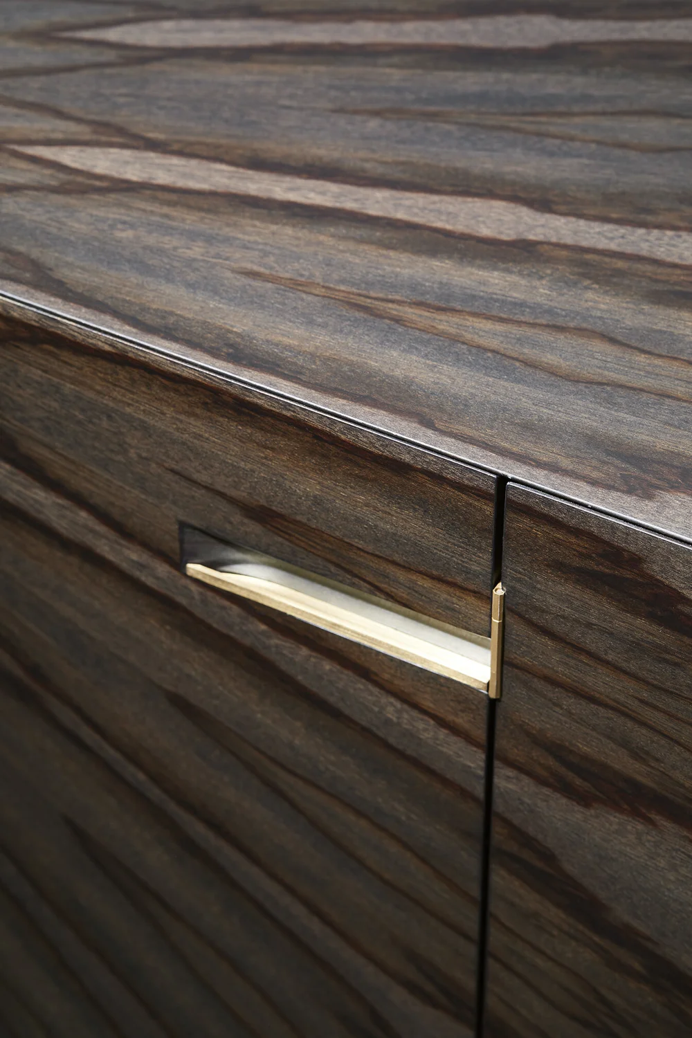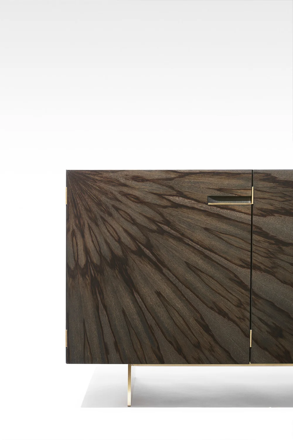 The Aton Sideboard, designed by Bina Baitel for Philippe Hurel, is a refined expression of contemporary French artistry and material sophistication. Its architectural silhouette is enveloped in exotic dogwood veneer, selected for its nuanced grain and depth, creating a richly textured and luminous façade across four impeccably integrated doors.