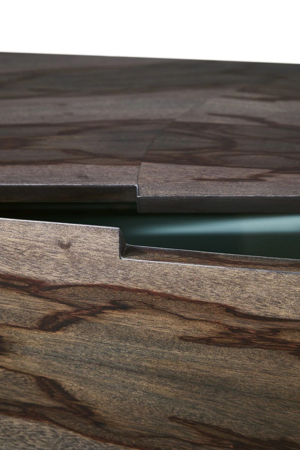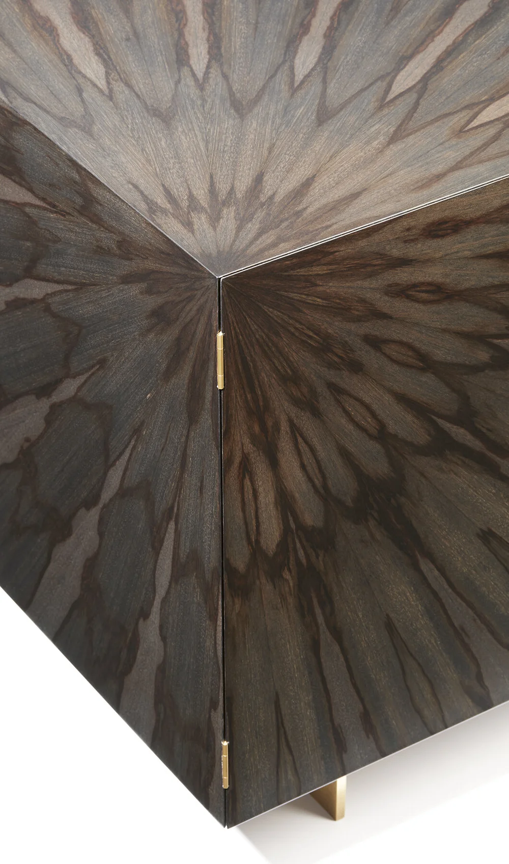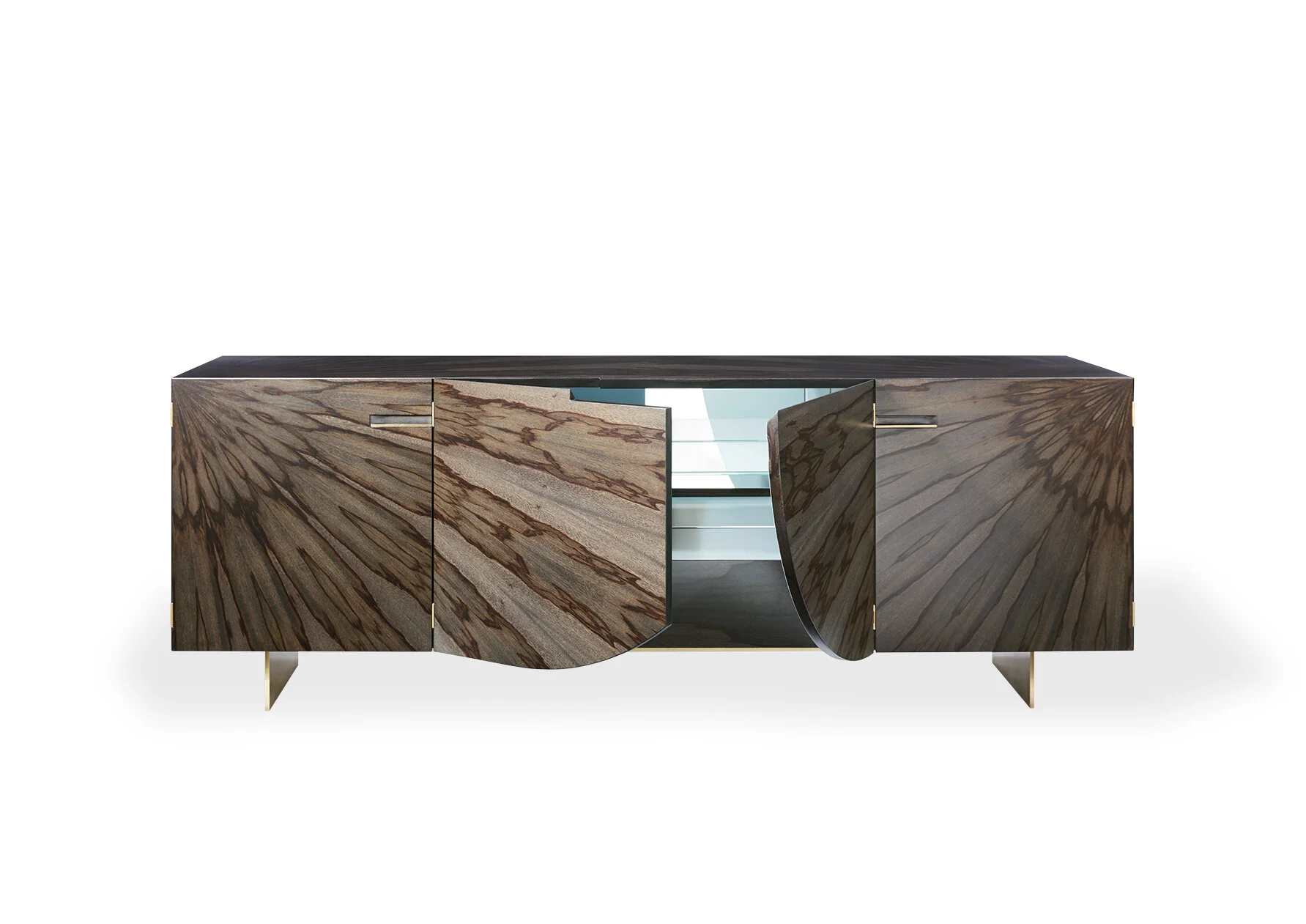 The Aton Sideboard, designed by Bina Baitel for Philippe Hurel, is a refined expression of contemporary French artistry and material sophistication. Its architectural silhouette is enveloped in exotic dogwood veneer, selected for its nuanced grain and depth, creating a richly textured and luminous façade across four impeccably integrated doors.