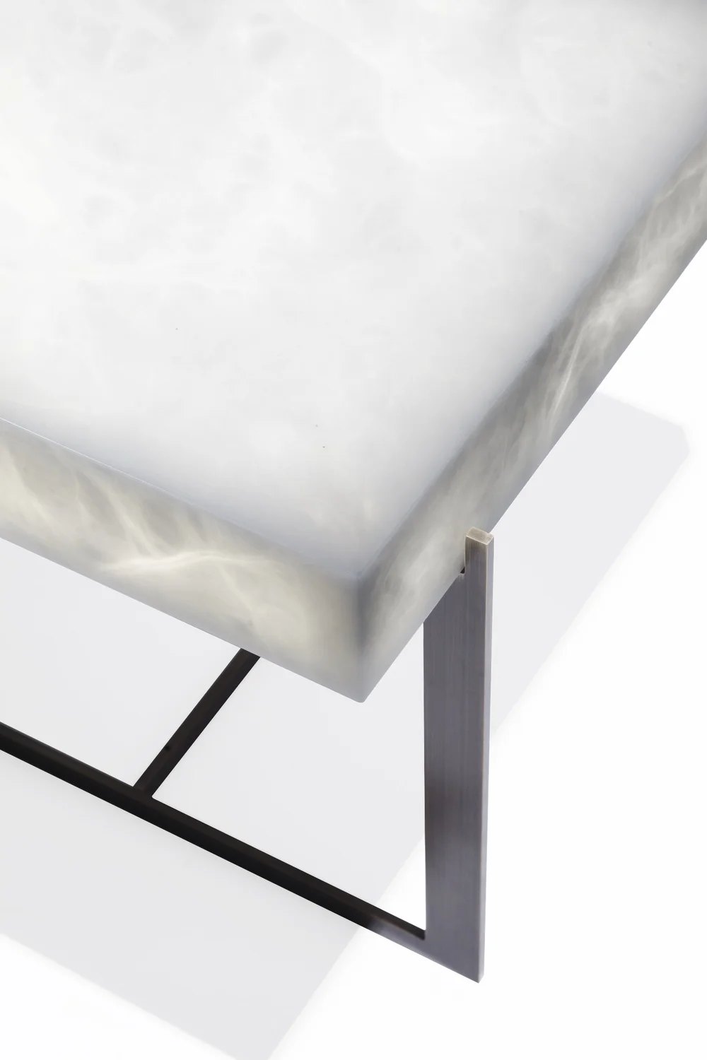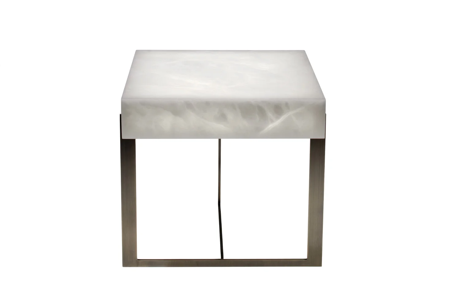 Available in three distinguished finishes, each variation offers a distinct expression of luxury. Choose a larch wood top paired with a patinated metal base for understated warmth and contemporary character. The sandblasted oak top with a patinated brass base introduces texture and subtle luminosity. For the most elevated interpretation, a custom alabaster top rests upon a bronze base, a collaboration between Maison Philippe Hurel and the renowned Ateliers Alain Ellouz, celebrated specialists in alabaster design.