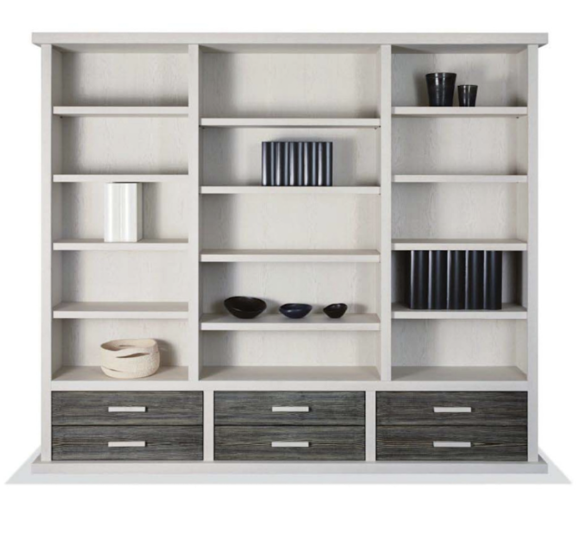 The lower section features five drawers and a drop-front storage compartment, all faced in stained larch wood, providing discreet and elegant storage. With its harmonious blend of materials and meticulous craftsmanship, the Helian Shelving Unit brings a sophisticated presence to any interior. Made in France.