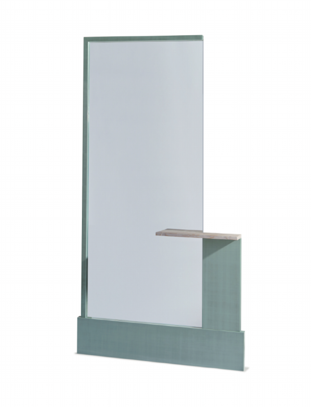 The Illusion Wall Mounted Mirror by Philippe Hurel is a sophisticated interplay of material and technique. Its frame is crafted in solid larch wood, finished in a refined washi lacquering process that lends depth and subtle texture to the surface. A shelf in stained larch wood is seamlessly integrated, offering both function and a thoughtful architectural detail. The composition brings a quiet elegance to any interior. Expertly made in France. Width 45\" Depth 11\" Height 86.5\"