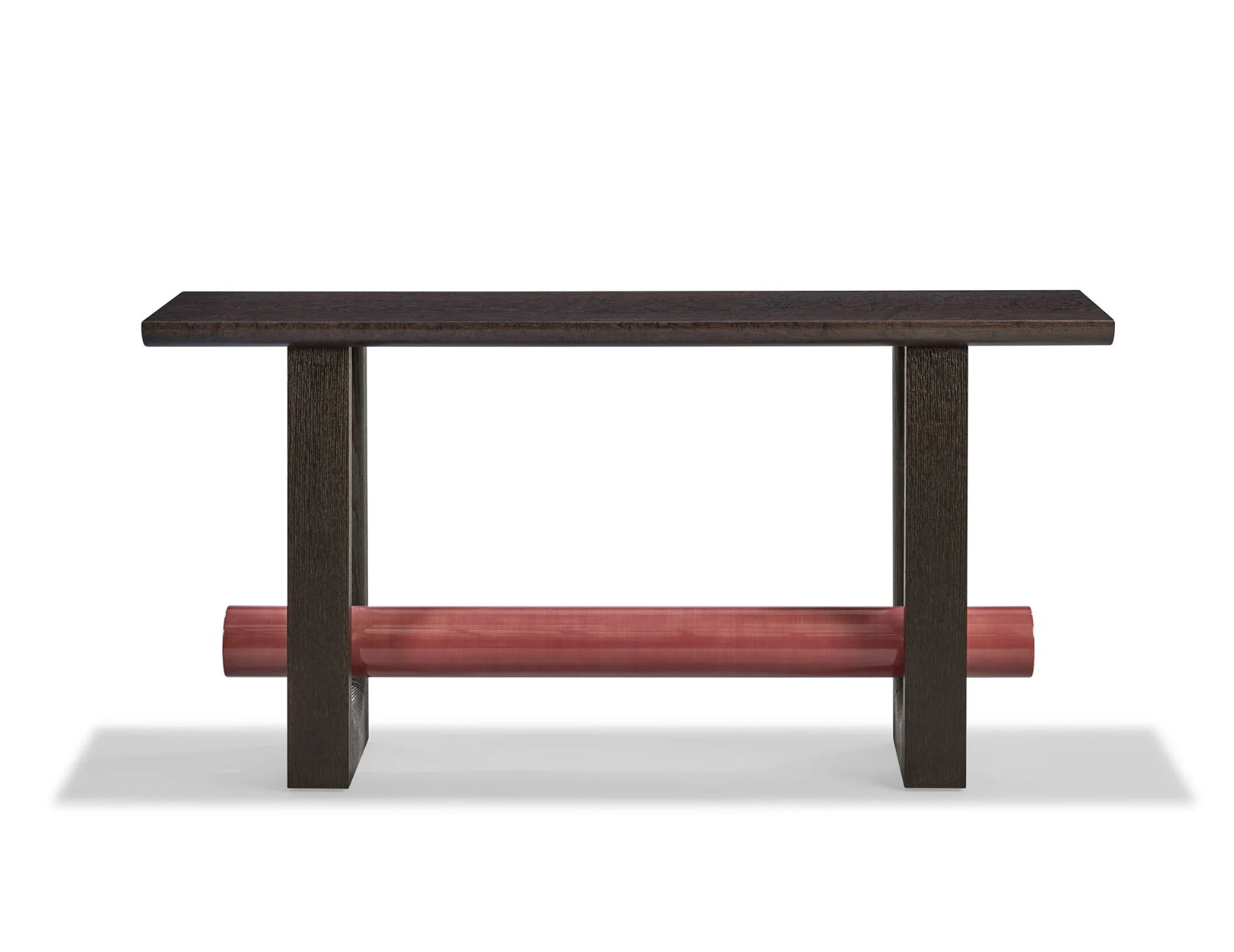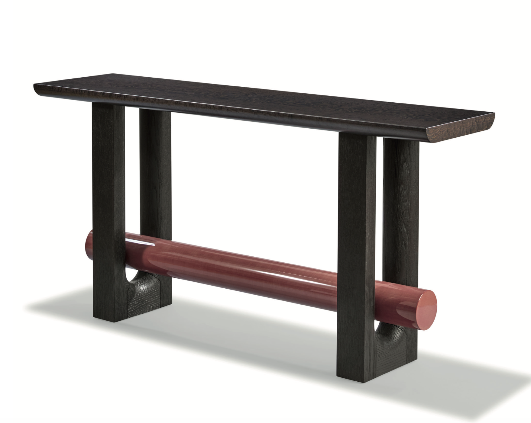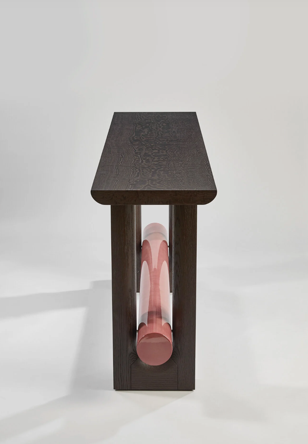 Designed by Pierre Gonalons for Philippe Hurel, the Mirage Console Table is a sophisticated study in material contrast and contemporary French craftsmanship. The console features a solid oak structure paired with a tamo wood veneered top, supported by a sculptural double-pedestal oak base joined by a solid oak round stretcher finished in refined washi lacquer. An alternative configuration is available entirely in oak for a more monolithic expression.