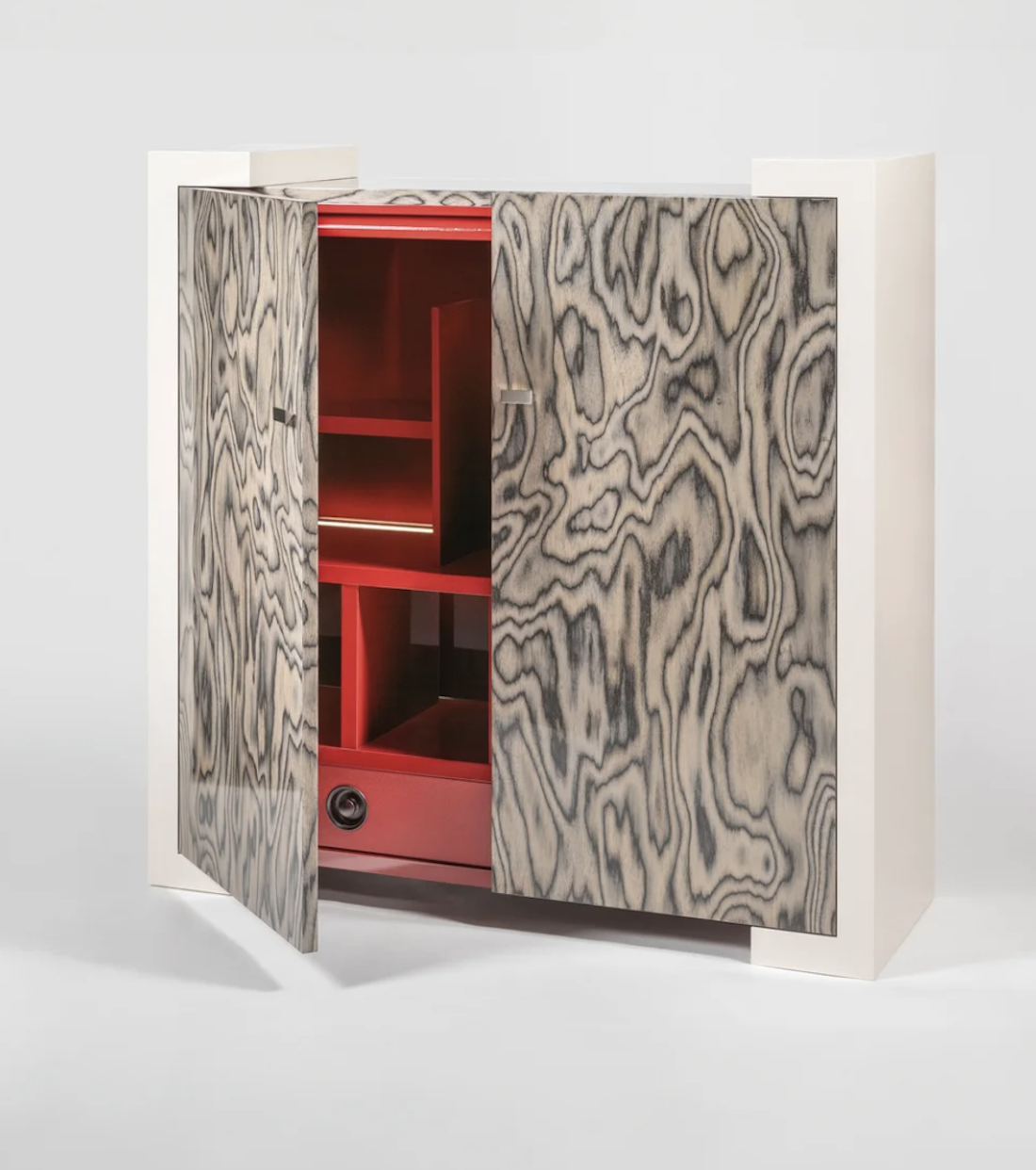 The Otto Shoe Chest by Philippe Hurel is a refined storage piece that blends exceptional materials with meticulous craftsmanship. Made in France, it features textured metal sides, a parchment top, and doors accented with natural horn handles. The interior is finished in beautifully figured curly maple and is thoughtfully designed with one drawer and five adjustable shelves illuminated by integrated LED lighting. Both functional and sculptural, the Otto Shoe Chest offers an elegant solution for organizing and displaying a fine footwear collection.