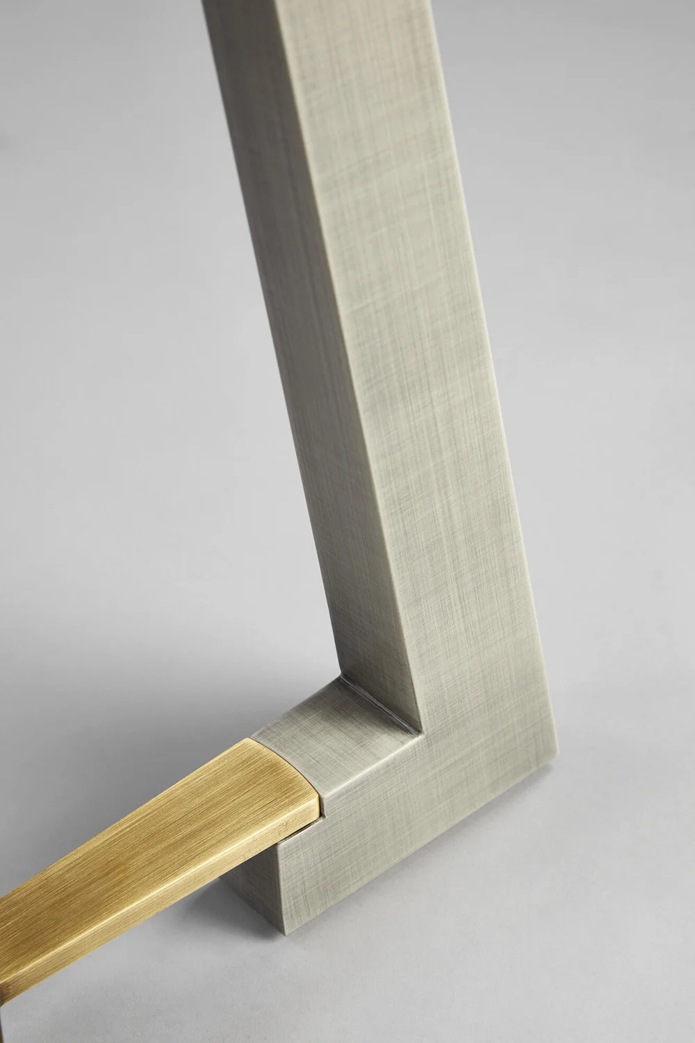 Two distinctive compositions are offered. The first pairs an oak top and base with a brass finished stretcher, creating a harmonious interplay of warmth and subtle luster. The second features a Tamo wood top set upon a washi lacquer finished base, also anchored by a brass finished stretcher, offering a more textural and artful expression. Both versions are available in a curated range of finishes, allowing for a tailored presentation.