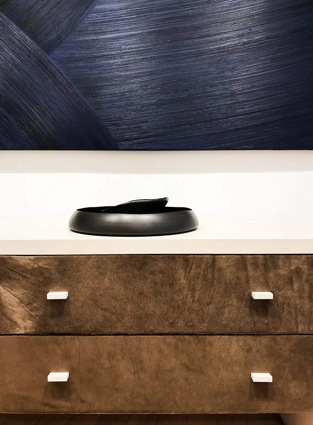 The Rouvre Chest of Drawers by Philippe Hurel is a refined storage piece that highlights the house’s dedication to exceptional materials and meticulous craftsmanship. The body is crafted in stained veneered oak with precisely mitered corners over solid wood, creating a clean, architectural profile. Leather fronted drawers introduce a rich textural contrast, while sculpted solid wood handles add a subtle yet distinctive finishing touch.