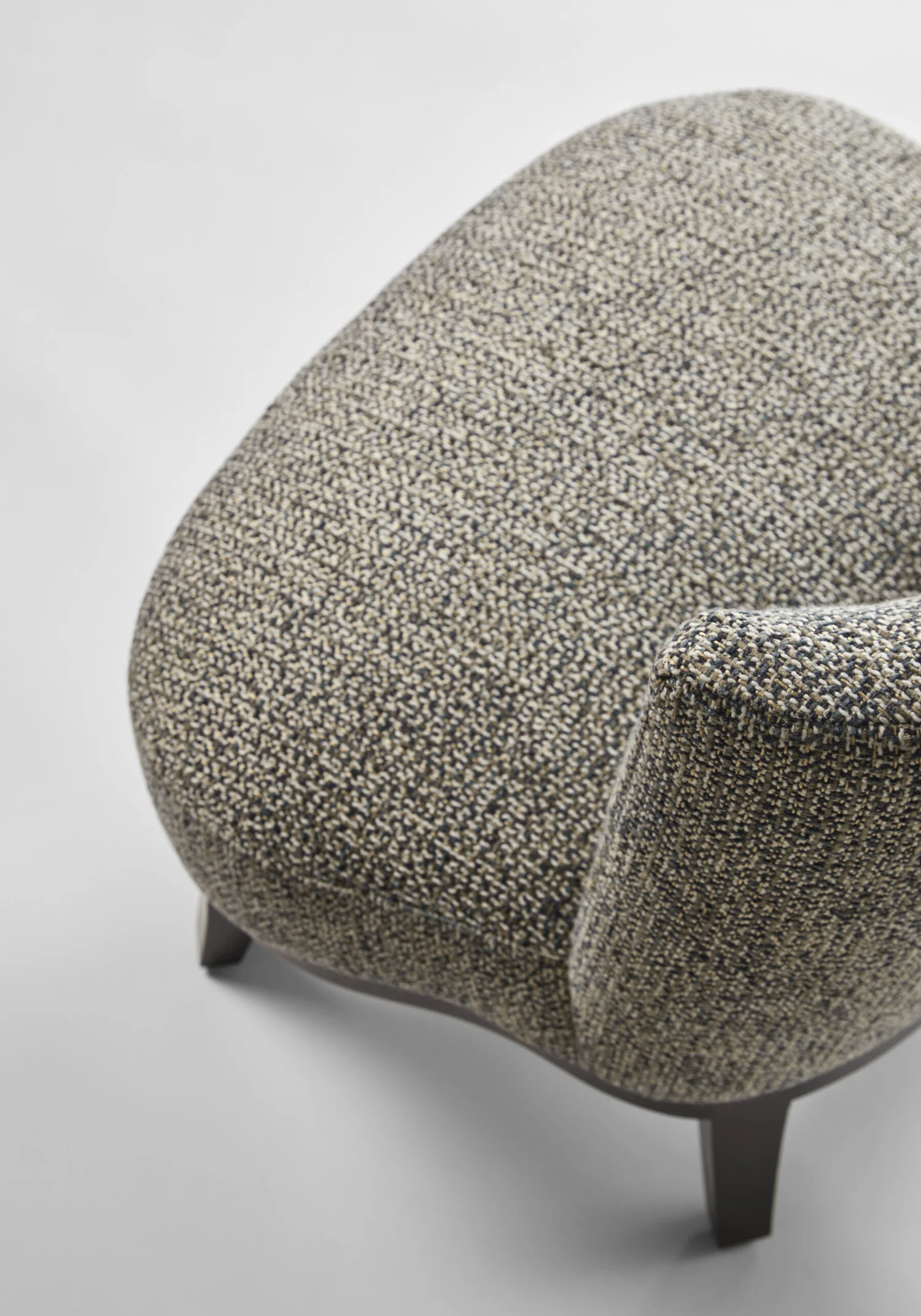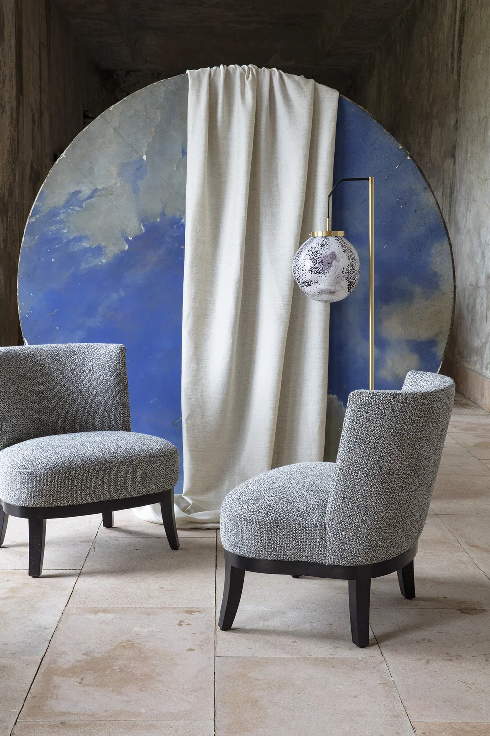 The chair is defined by its beautifully crafted stained beech wood frame, showcasing the natural depth and character of the wood while providing a graceful architectural foundation. Every line and proportion is thoughtfully resolved, highlighting the exceptional craftsmanship behind the design. Handcrafted in France.