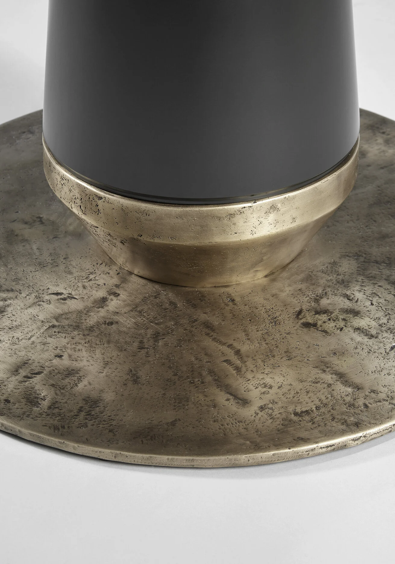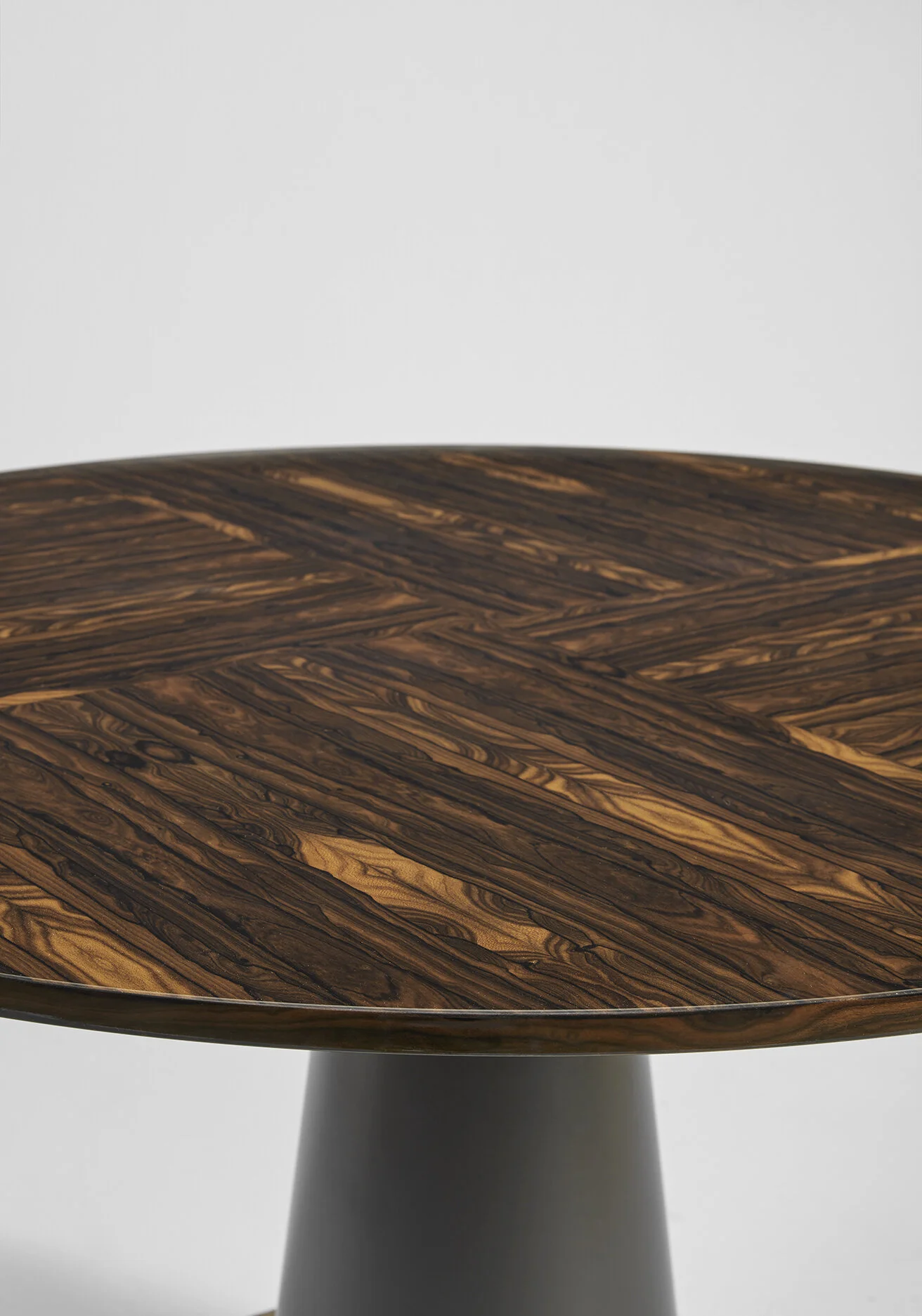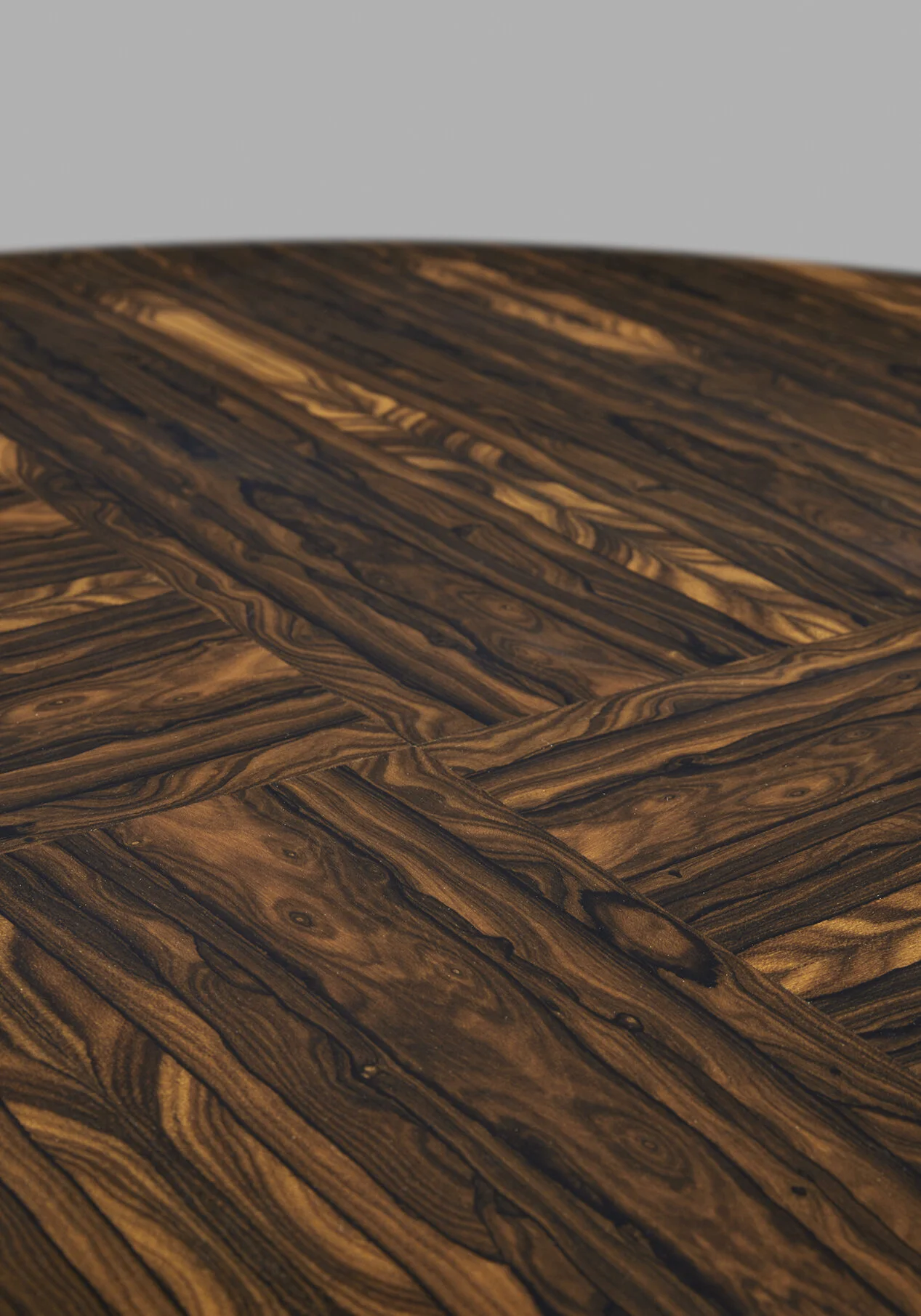 The Silvio Center / Dining Table by Philippe Hurel is a striking expression of contemporary elegance. Its tabletop is veneered in richly figured Ziricote wood, composed in four carefully aligned sections that celebrate the natural depth and movement of the grain. Anchored by a black lacquered central pedestal and finished with a sculptural cast brass foot, or with an oak top and pedestal, the Silvio table balances bold materiality with impeccable craftsmanship. Handcrafted in France, it reflects Philippe Hurel’s commitment to precision, artistry, and enduring design.