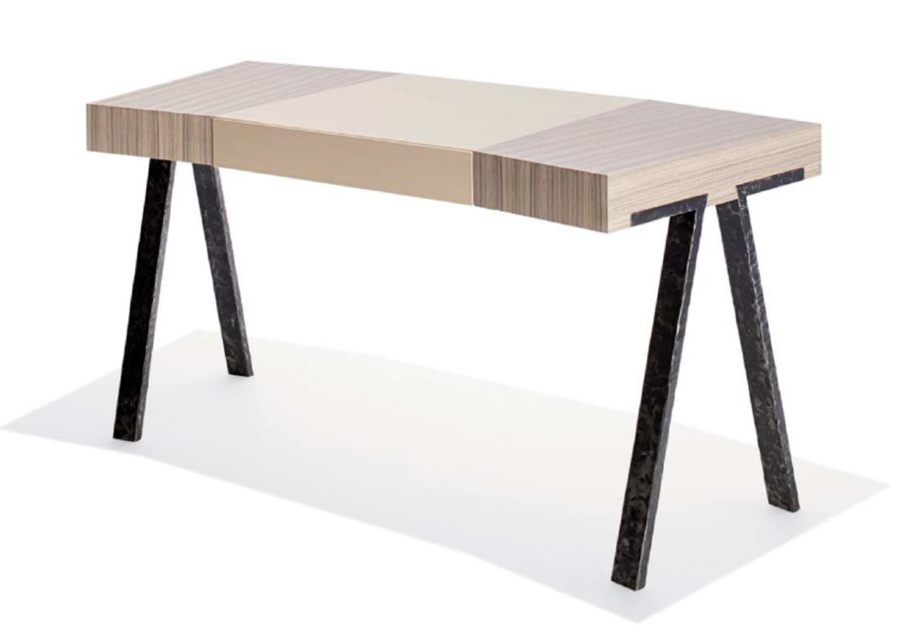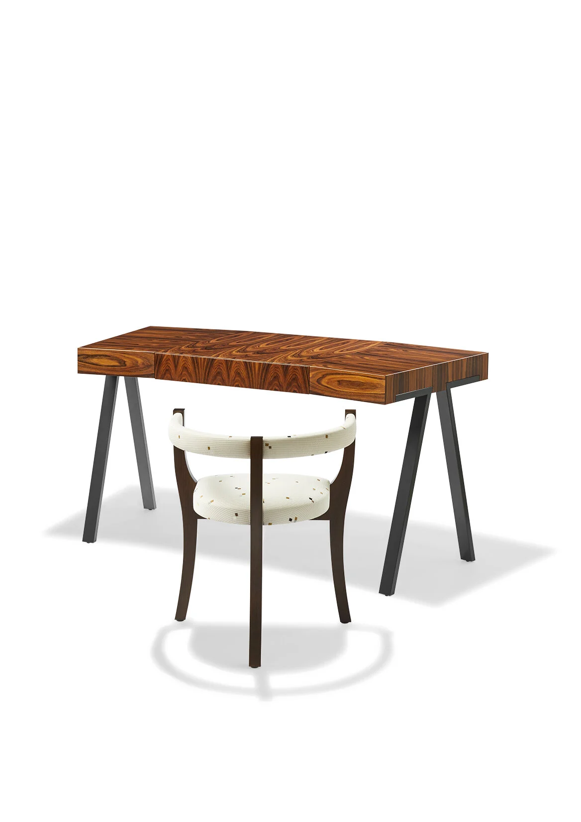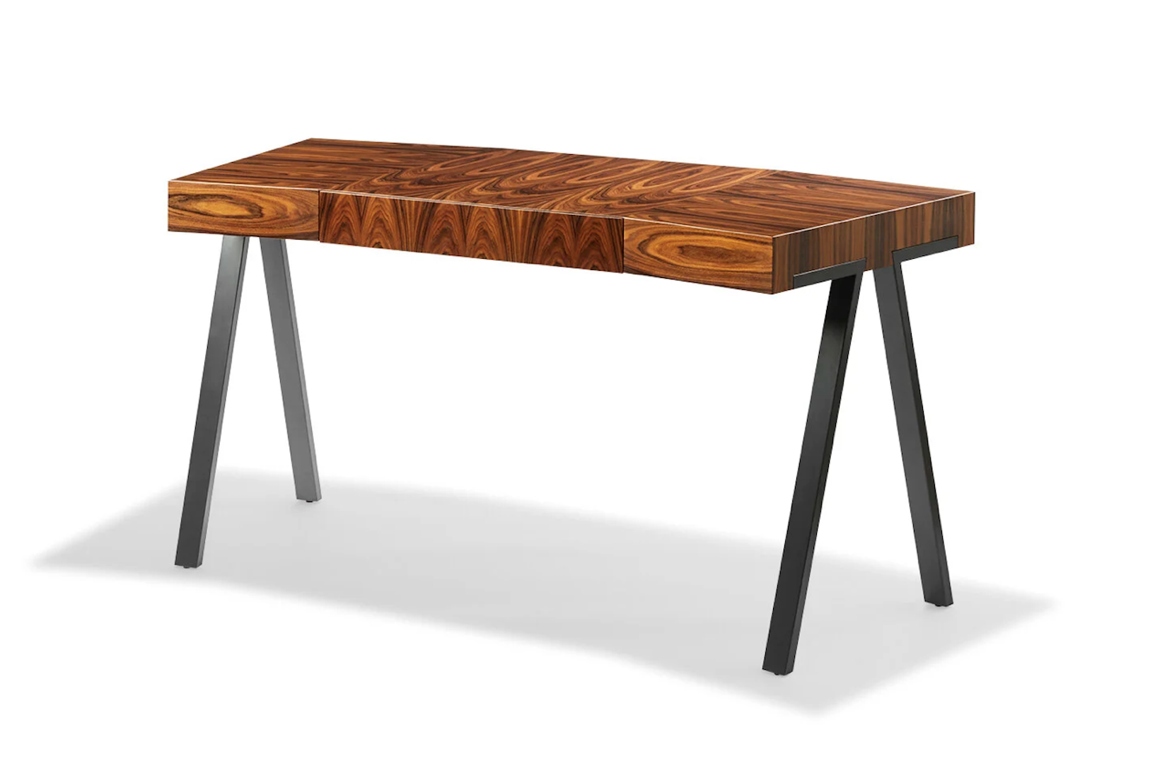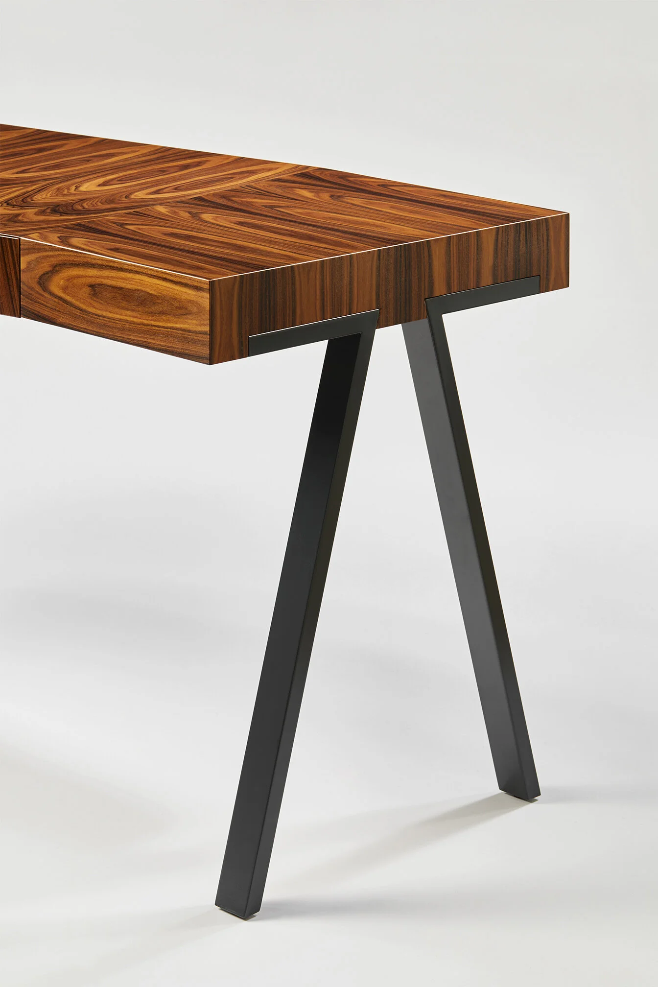 The Sven Desk by Philippe Hurel reflects a balance of refined materials and contemporary design. Made in France, it is available in two distinct finishes: a lacquered top paired with sleek stainless steel legs, or a richly grained zebrano wood top featuring a central leather blotter and sculptural hammered metal legs in a black patina. The desk includes a discreet drawer for essential storage, maintaining its clean architectural lines. As shown in the second picture, a custom version is available in Santos rosewood, highlighting the exceptional craftsmanship and bespoke possibilities of the piece.