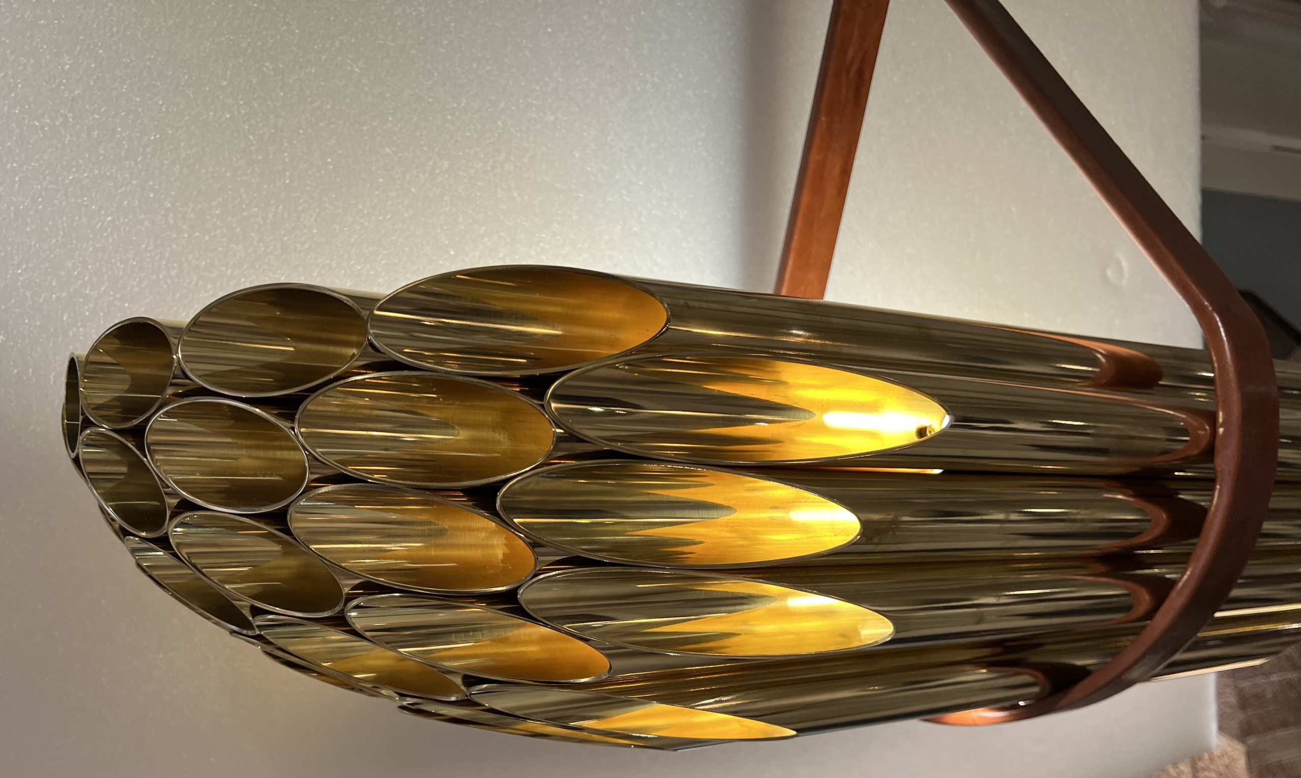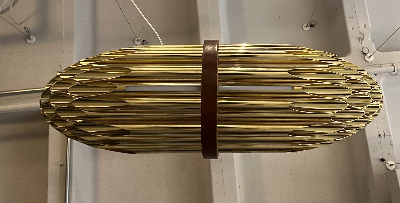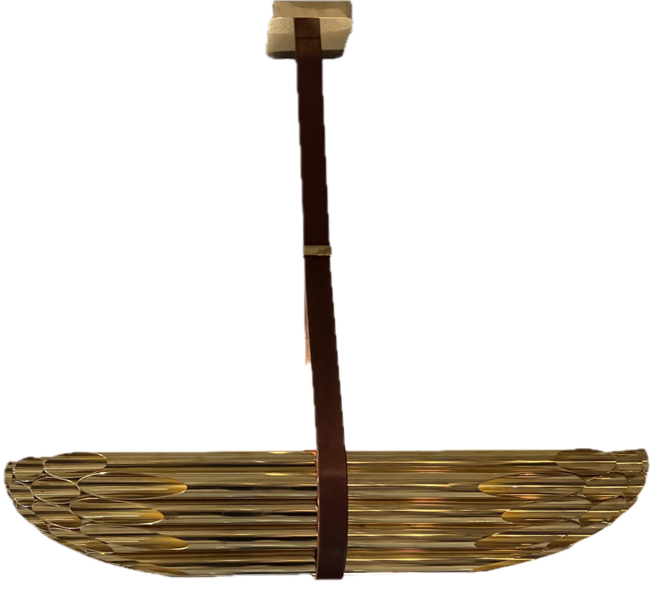 Suspended within a finely crafted leather-wrapped cradle, the piece balances precision engineering with tactile elegance. Available in a curated selection of metal finishes and leather tones, the Ellis Chandelier can be tailored to complement a range of sophisticated interiors. Made in Italy.