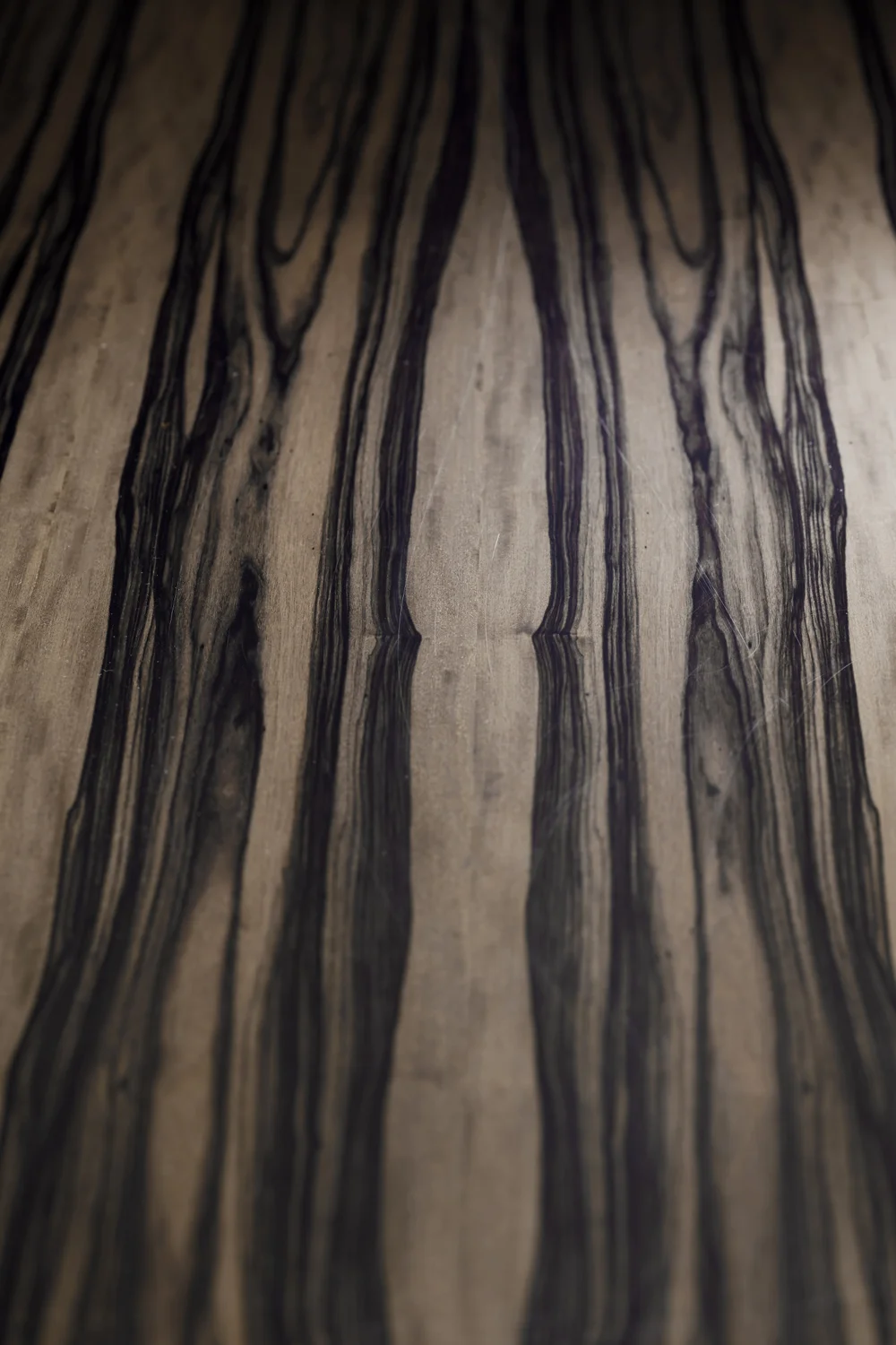 The first pairs a stained oak top with a leather-clad base, combining warmth with tailored elegance. The second features a stained oak top set upon a high gloss lacquer base, finished in the color of your choice for a striking, customized statement. The third presents a Macassar ebony top with a base enveloped in parchment, creating a richly layered interplay of texture and tone.